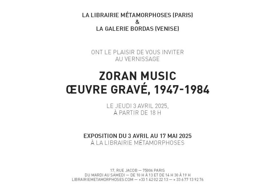 Die Pariser Buchhandlung Librairie Métamorphoses zeigt in Zusammenarbeit mit der Galerie Bordas (Venedig) eine Auswahl der grafischen Arbeiten von Zoran Music aus den Jahren 1947 bis 1984. Die Ausstellung bietet einen konzentrierten Einblick in das druckgrafische Werk des Künstlers, das durch seine feine Linienführung und eindringliche Bildsprache geprägt ist.